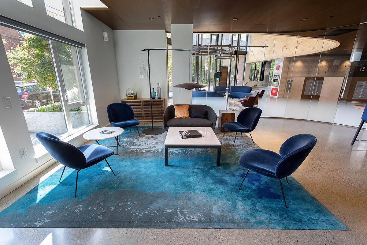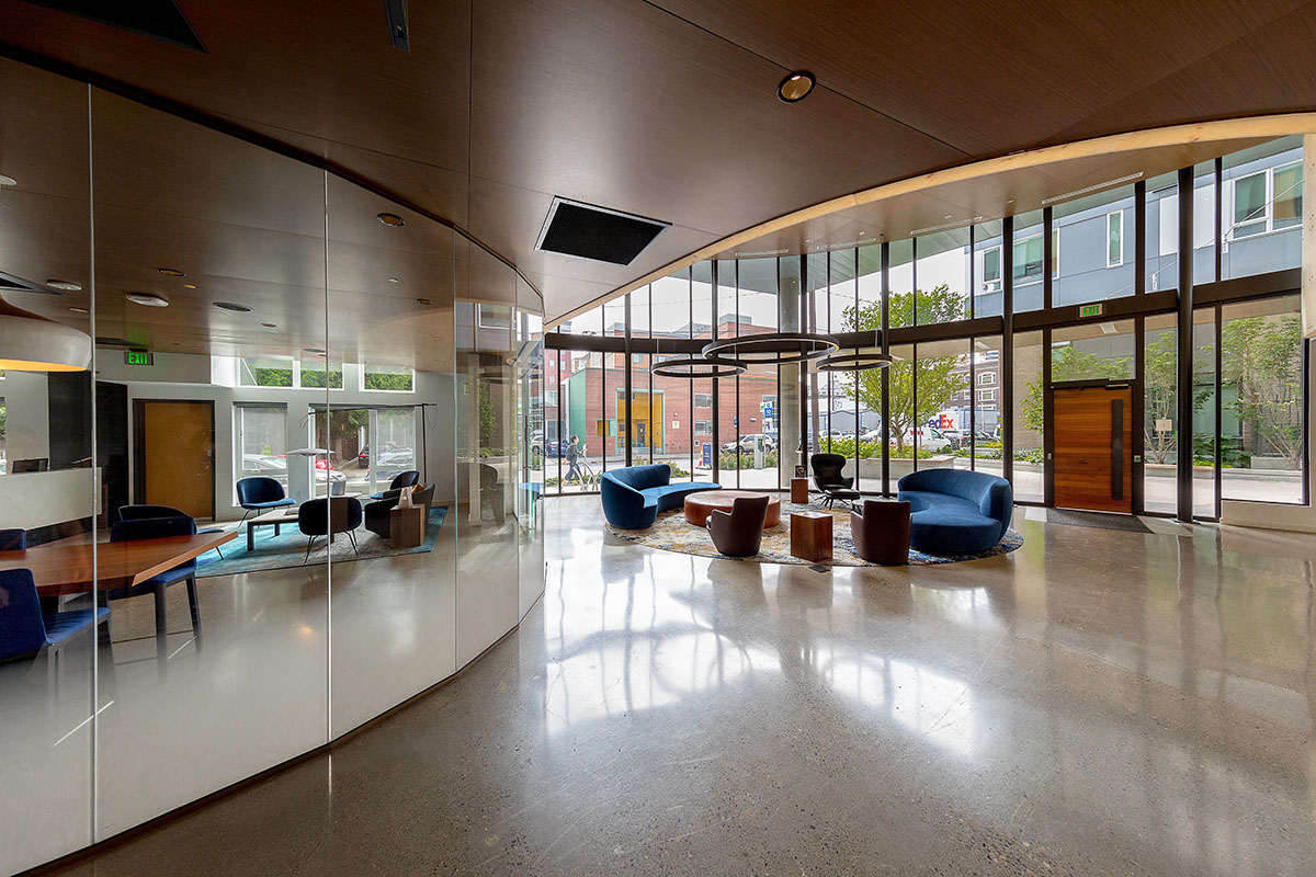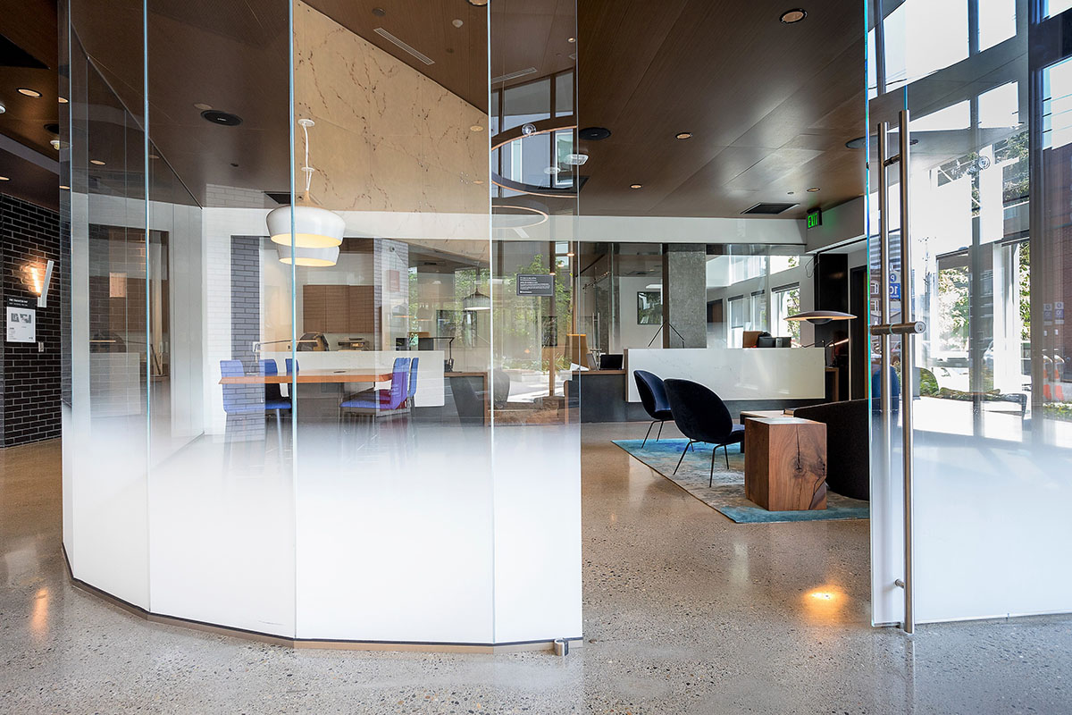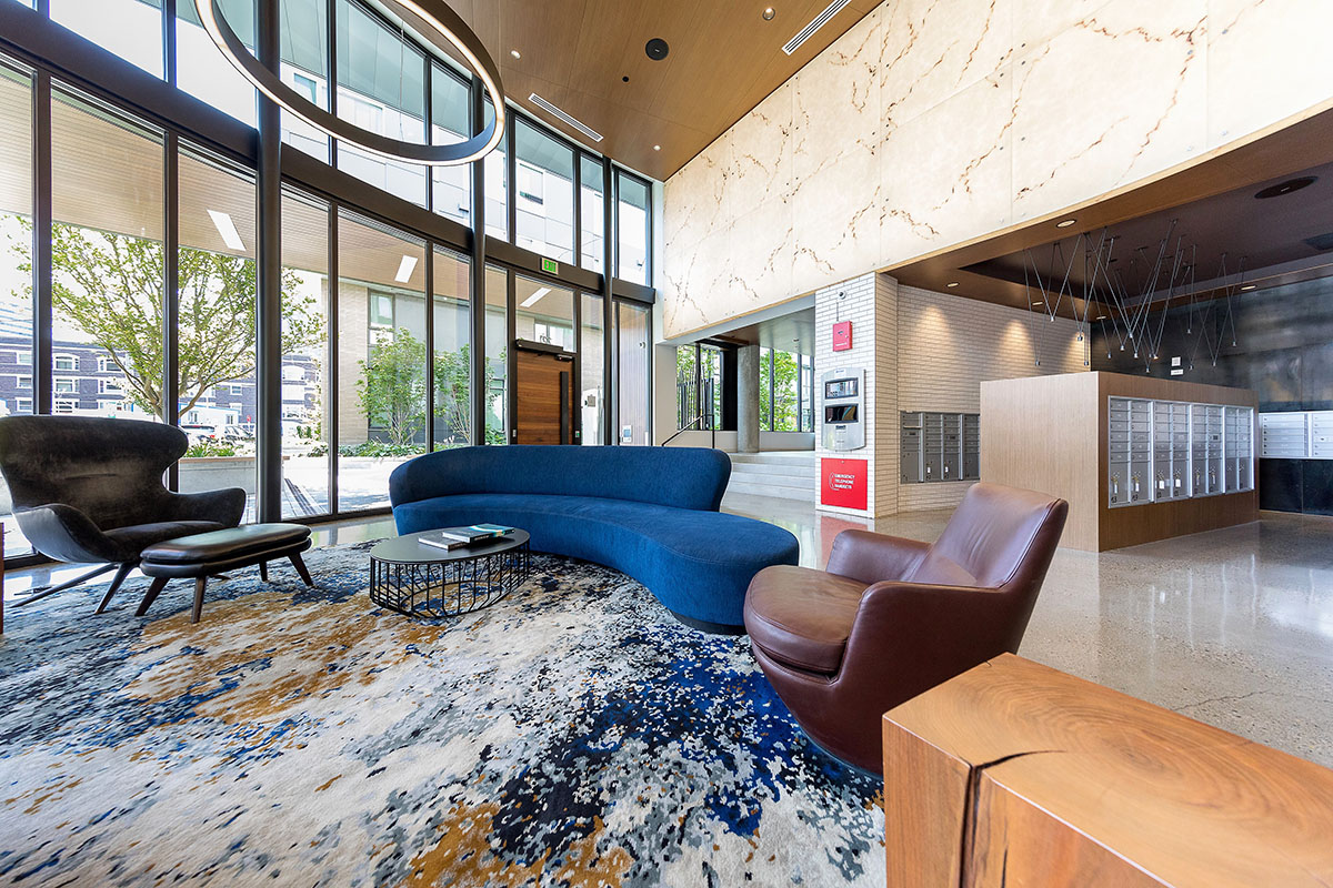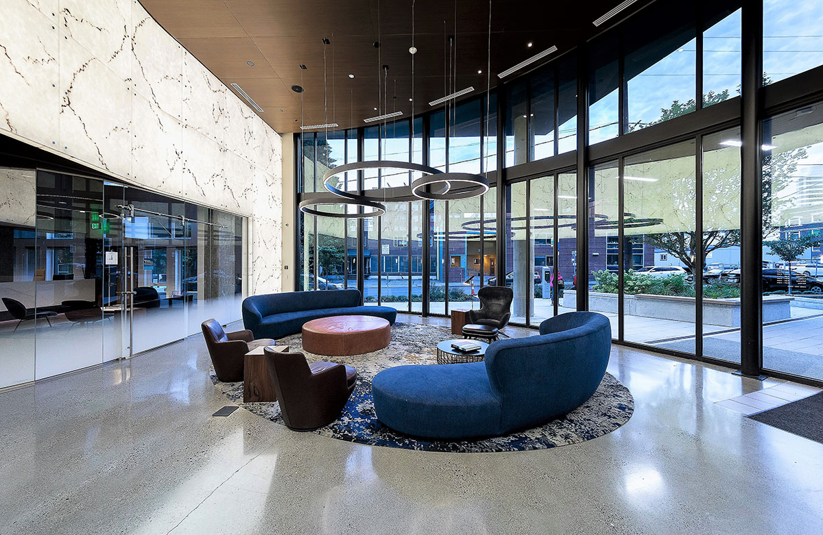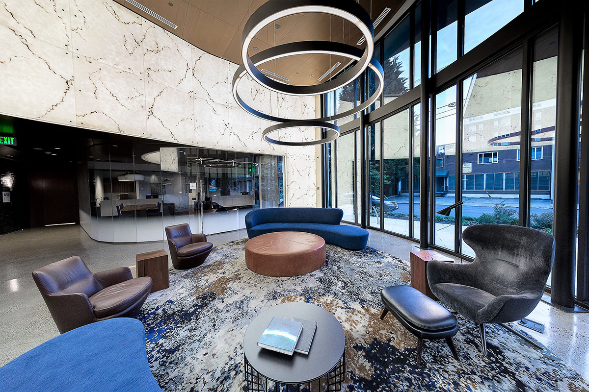 Robin Chell Design was retained to design the building's soaring main lobby, and to design and procure FF&E and artwork for the entire project. The main lobby features illuminated 3form panels and blackened steel in a curvilinear pattern. Custom rugs, murals and artwork reflect the themes and undertones of the Pacific Northwest, with imagery, patterns and tones that reflect the outdoors.