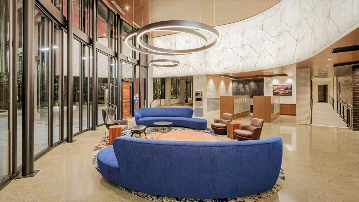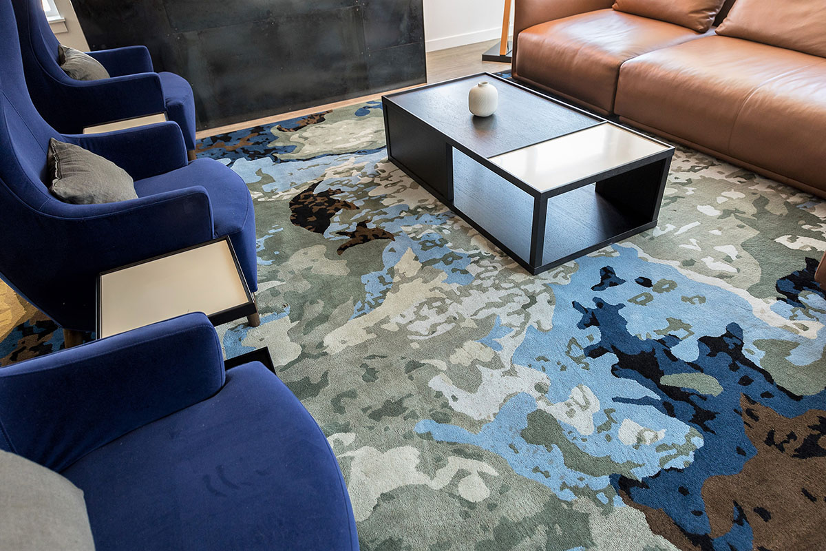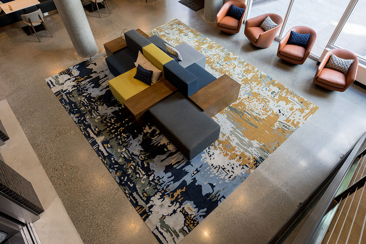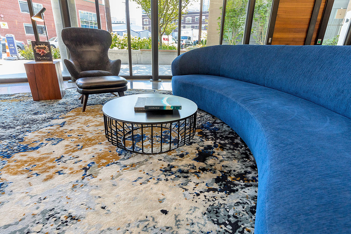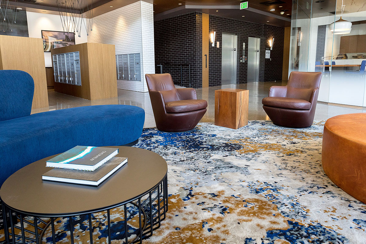 Robin Chell Design was retained to design the building's soaring main lobby, and to design and procure FF&E and artwork for the entire project. The main lobby features illuminated 3form panels and blackened steel in a curvilinear pattern. Custom rugs, murals and artwork reflect the themes and undertones of the Pacific Northwest, with imagery, patterns and tones that reflect the outdoors.