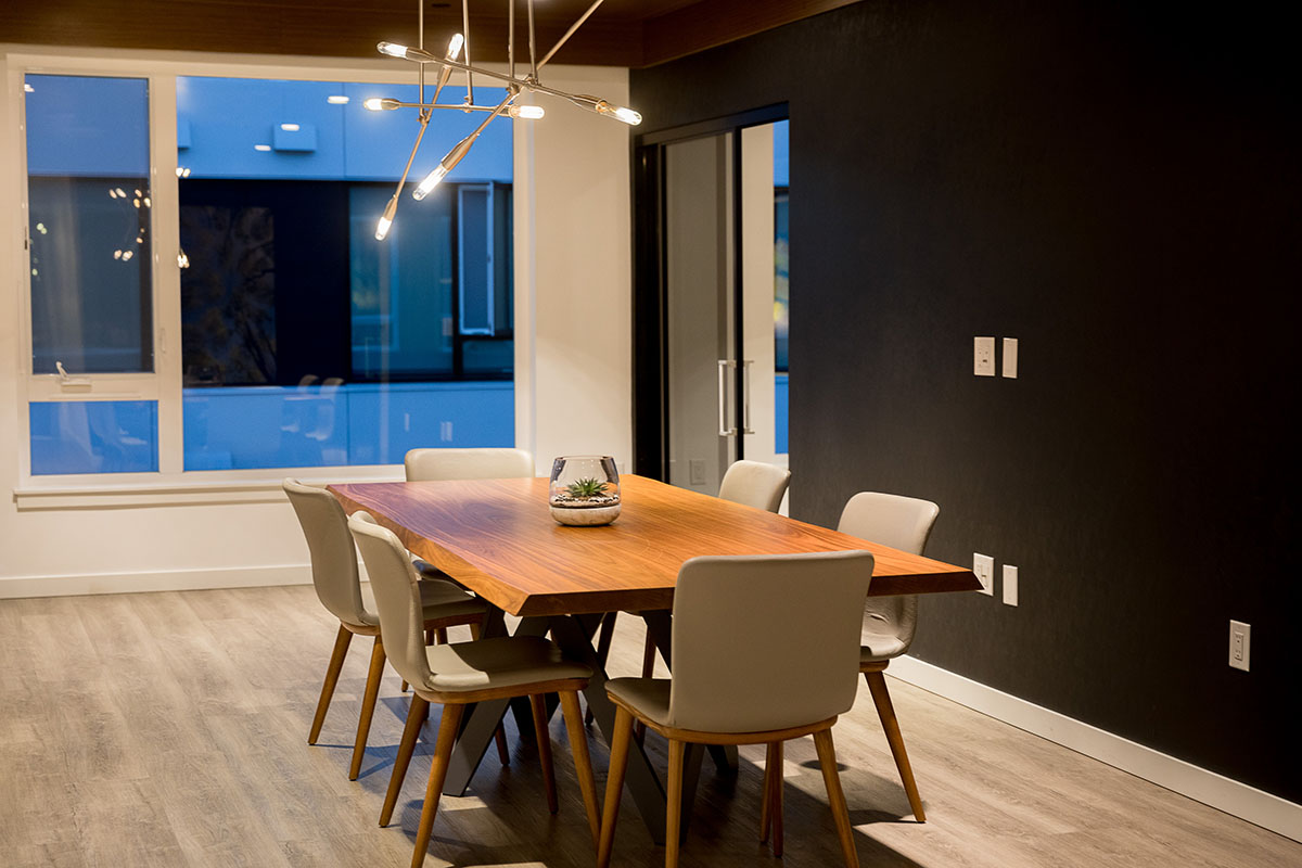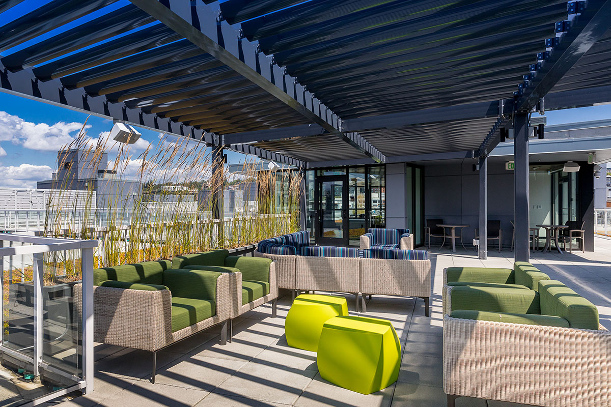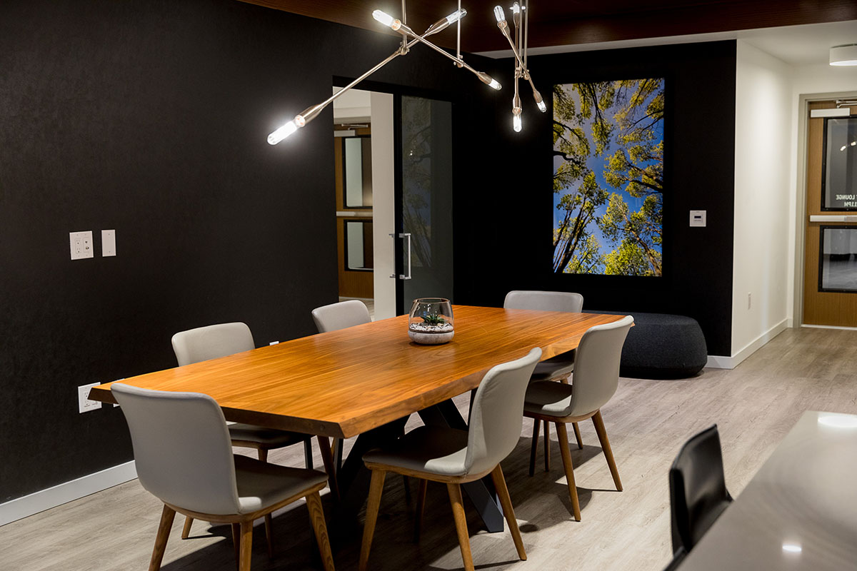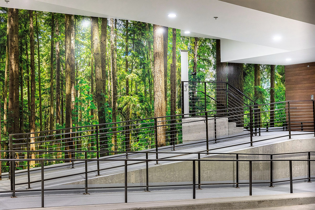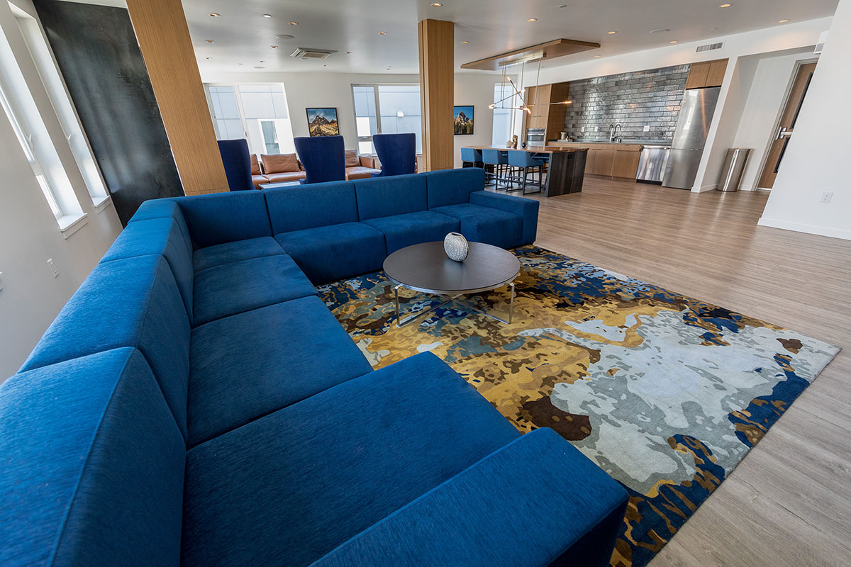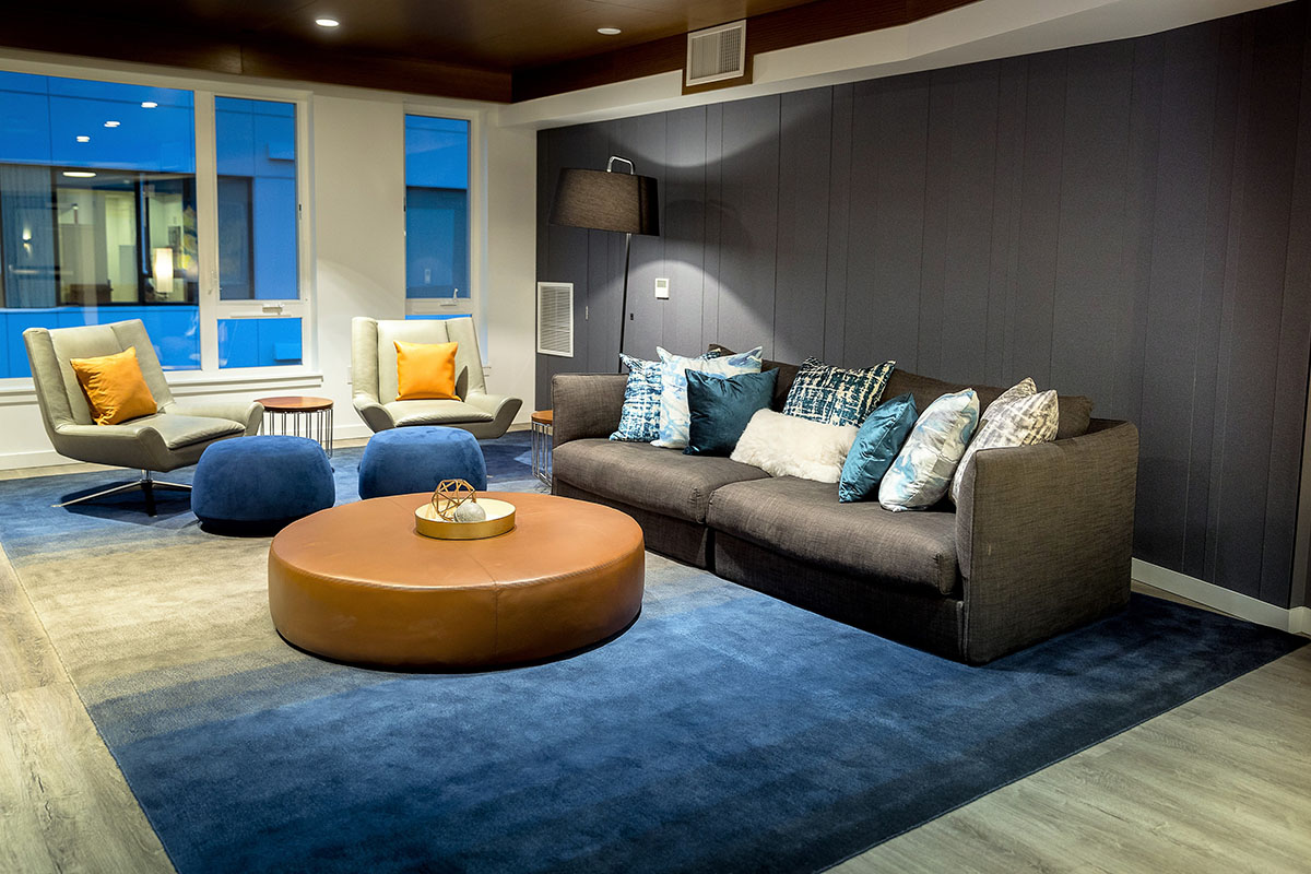 Robin Chell Design was retained to design the building's soaring main lobby, and to design and procure FF&E and artwork for the entire project. The main lobby features illuminated 3form panels and blackened steel in a curvilinear pattern. Custom rugs, murals and artwork reflect the themes and undertones of the Pacific Northwest, with imagery, patterns and tones that reflect the outdoors.