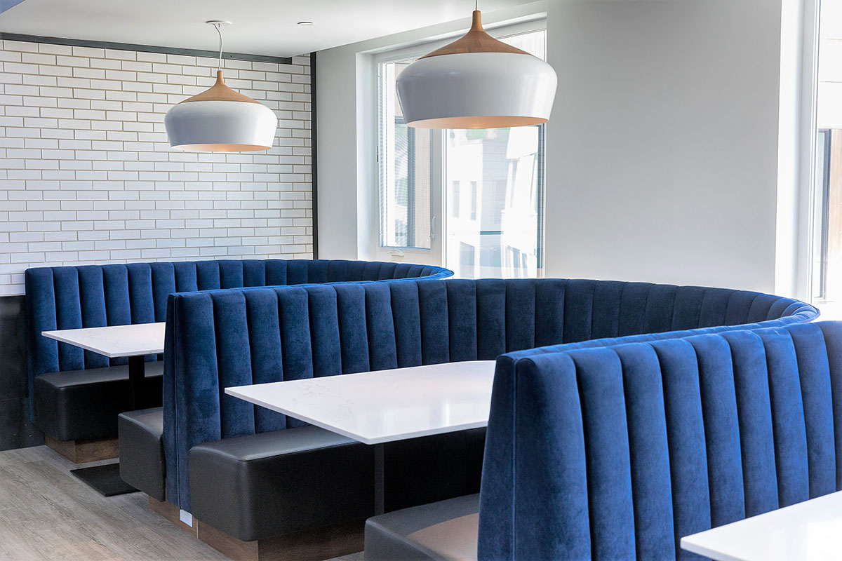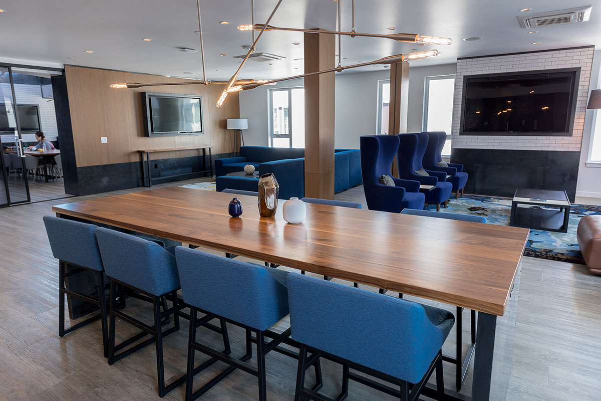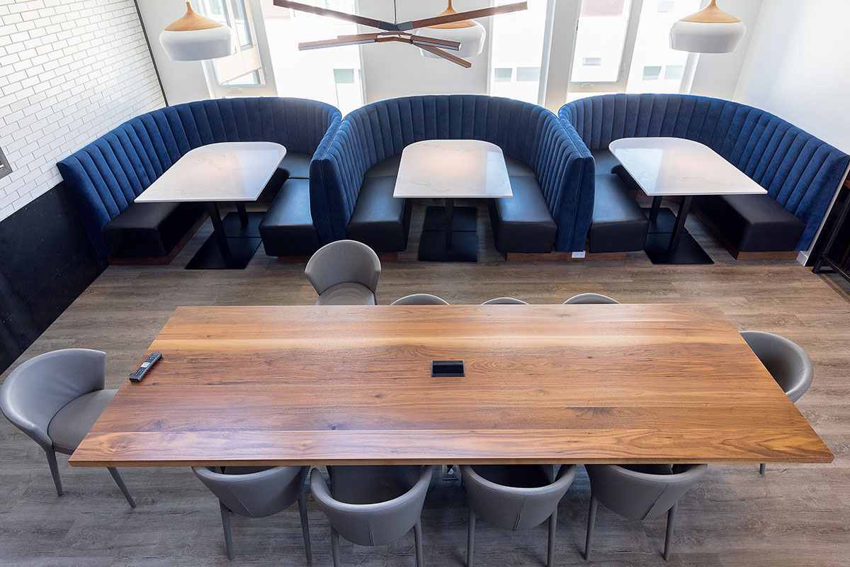 The building also features expansive outdoor terraces and a large ground floor plaza. Playful patterns and durable materials were considered for the outdoor FF&E. Indoor FFE included custom banquettes and tables.