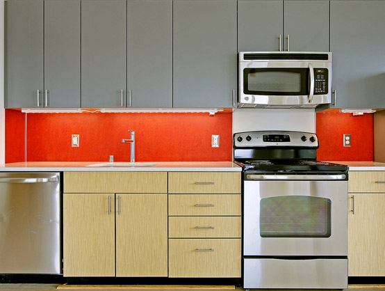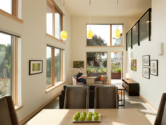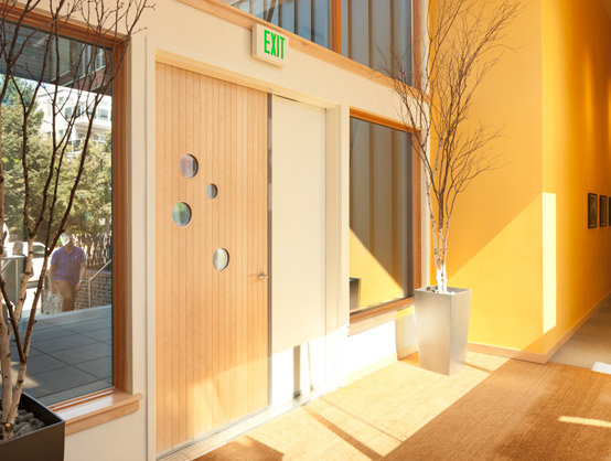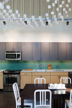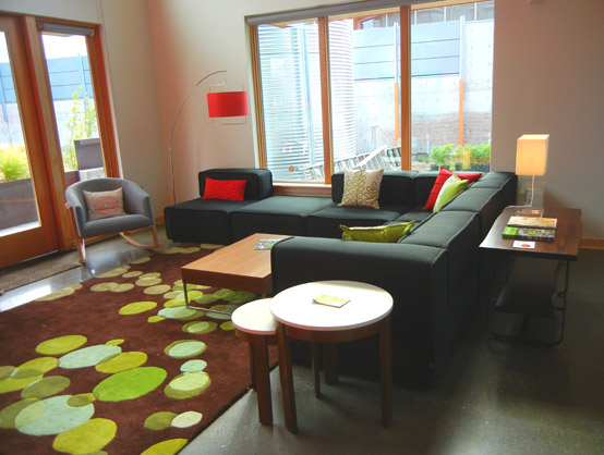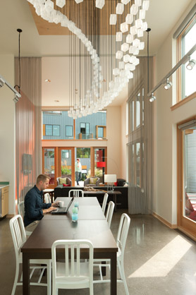 Interior finishes were locally sourced or sustainably manufactured wherever possible. Finishes included low or no VOC paints and carpets, bamboo hardwoods, and Environite, a solid surface countertop made of recycled glass and manufactured locally on Camano Island. RCD also incorporated Bolon, a plant-based flooring product, which achieved the highest rating for durability and water resistance.