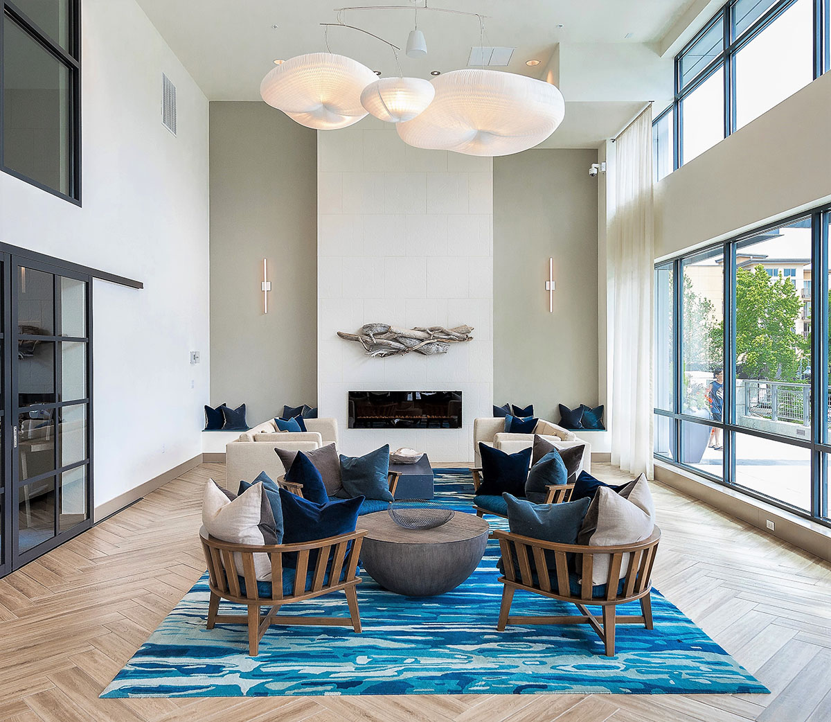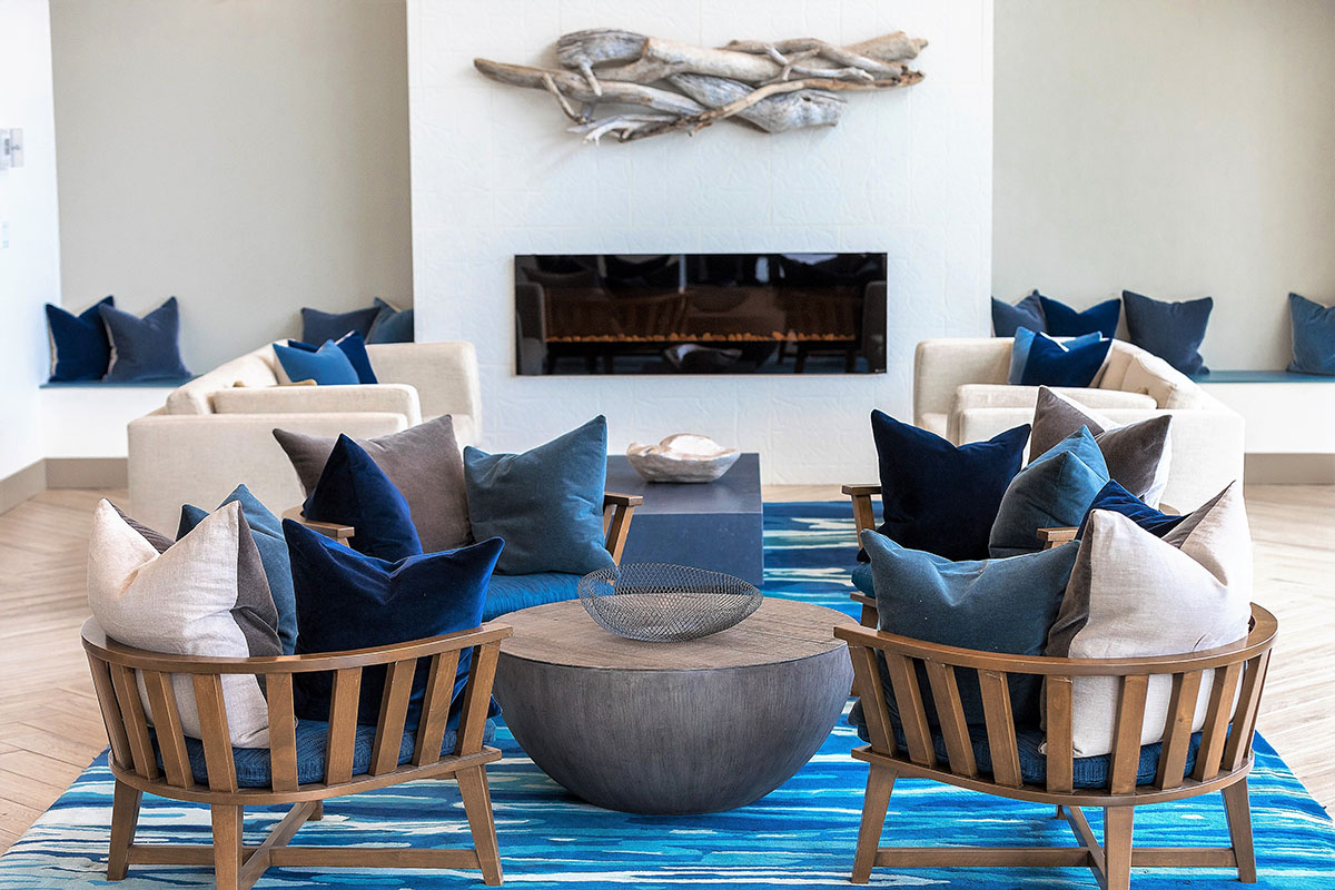 The common areas are inspired by the elegance and simplicity of island living. Warm, neutral materials and tones are complemented by water-inspired shapes and color. Driftwood-inspired woods and accessories are found throughout.