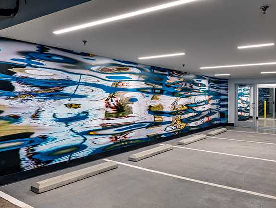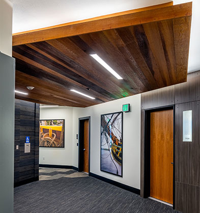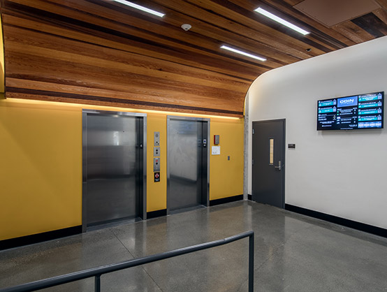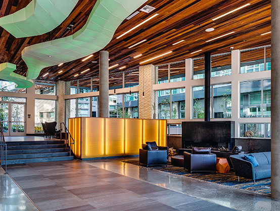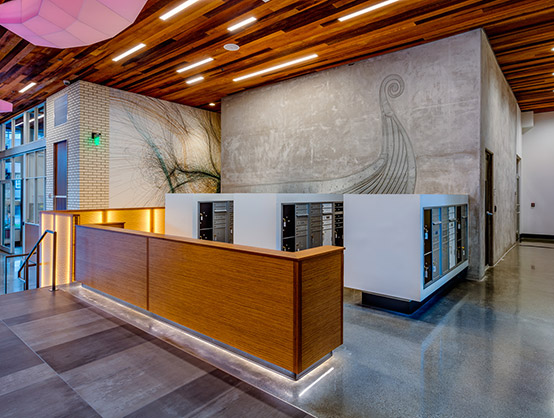 The interior finishes and overall building are influenced by Ballard's Scandinavian and maritime heritage. The grand lobby features a central light fixture that was inspired by the movement, colors and scale of the Aurora Borealis, a prominent feature in the night skies above Norway and Sweden. The lobby also features a large central fireplace, finished in blackened steel.